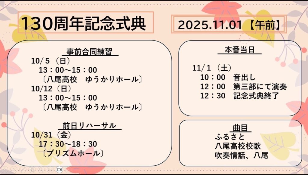 ⚠️記念式典での演奏は人数の確定が必要なので、参加の方は必ずフォームに返信をお願いします。(締め切りました。)
